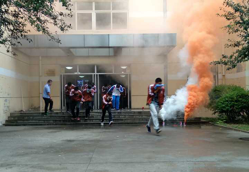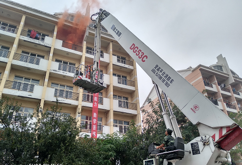 活动伊始,由主持人宣读此次活动的主要内容及注意事项。随后,以生动实例为2018级新生进行消防安全知识培训,并就如何佩戴呼吸面具、使用灭火器、如何进行灭火逃生等环节进行了讲解。之后,参加消防灭火演练的2018级新生在消防战士的指导下进行了消防灭火、逃生实战演练。宿舍楼放置的烟雾弹发出滚滚烟雾,保卫处负责人及公寓管理人员立即组织同学用湿毛巾捂住口鼻,快速、有序从逃生口撤离到安全地点。滨州市消防支队的消防车到达现场,多条水龙立刻喷向“着火点”,“火情”得到控制。消防人员搭起拉梯,设置逃生绳索,并迅速启动登高车对高层被困员工进行救助。经过全体人员奋战,“大火”最终被扑灭。