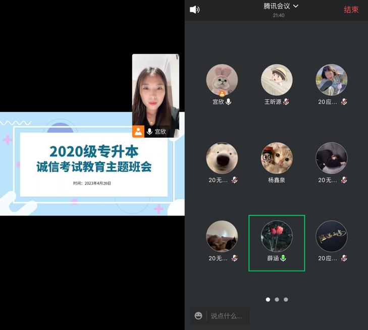 为深入贯彻落实省教育厅和学校专升本工作的相关要求,提高2023届专升本考生的诚信意识,培养员工诚信品质,营造诚信、感恩、励志的校园文化氛围。4月20日晚,伟德国际bevictor1946召开线上专升本诚信考试教育主题班会,2020级辅导员宫欣主持班会,全体专升本考生参加了会议。