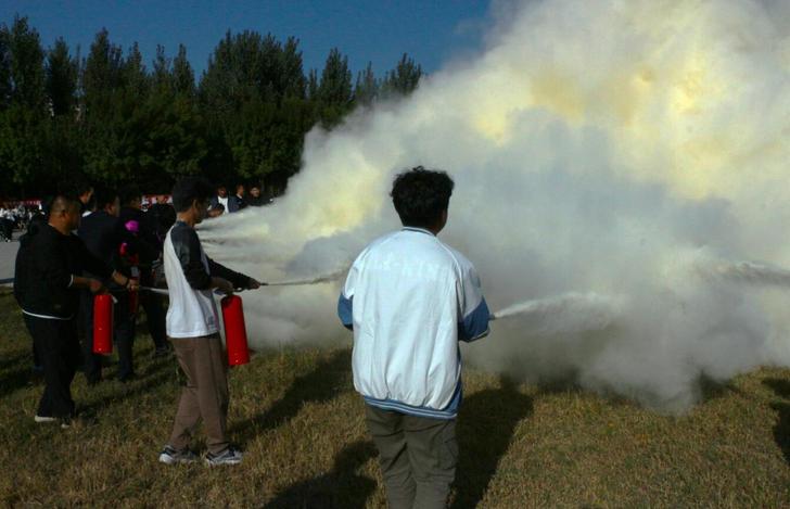 培训会最后,同学们在保卫处消防科王亮亮老师和李俊老师的指导下学习了灭火器材的使用方法,并进行了灭火实战演练。