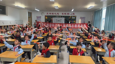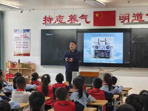 活动伊始,赵望锋结合生动案例,向孩子们系统讲解了无人机的种类、核心构造、多元应用场景及基本飞行原理,从农业植保无人机到航拍无人机,从机身结构到动力系统,复杂的专业知识在他的解读下变得通俗易懂,点燃了孩子们的探索热情。在航模组装环节中,队员李浩磊作为主讲人清晰拆解安装流程,其余成员则每人带领5名小朋友组成小组,在教室中央手把手指导操作。面对孩子们层出不穷的疑问,志愿者们耐心答疑,协助他们精准拼接零件,看着零散的部件逐渐成型,孩子们的脸上洋溢着成就感。转至操场飞行环节,社团成员严格按照安全规范划定飞行区域。演示时,志愿者特意放慢操作节奏,细致讲解:“左手杆轻推起飞,力度就和我们社团低空悬停训练时一样,千万不能猛推。”轮到小朋友体验时,志愿者半蹲在侧,一手轻扶孩子们的手腕辅助操控,一手紧盯无人机飞行状态,全程筑牢安全防线,让孩子们在安全保障下感受飞行乐趣。